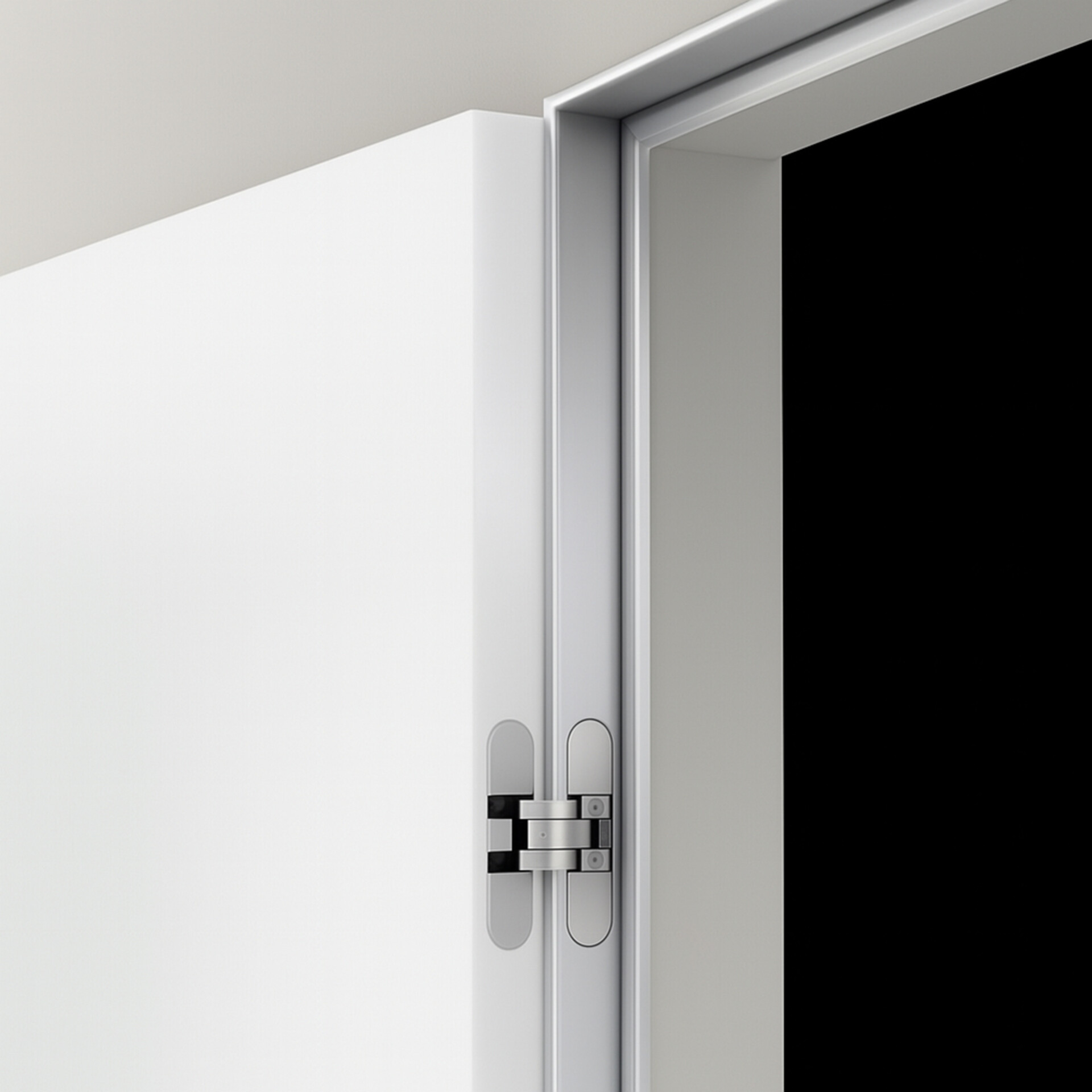 Скрытая дверь интегрируется в стену так, что проём «исчезает», визуально расширяя пространство и подчеркивая стиль, лаконичное решение без лишних рамок и наличников.