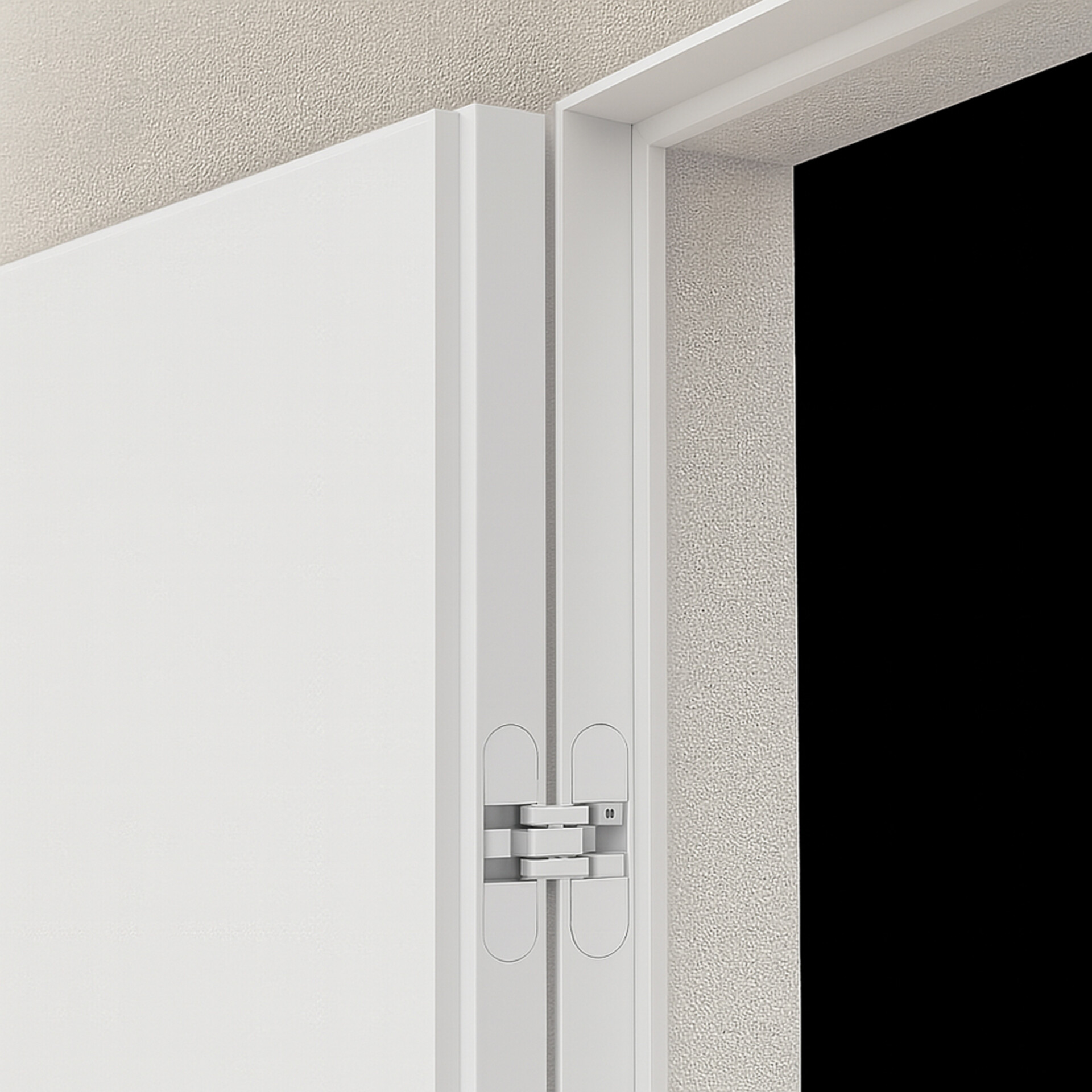 Скрытая дверь интегрируется в стену так, что проём «исчезает», визуально расширяя пространство и подчеркивая стиль, лаконичное решение без лишних рамок и наличников.