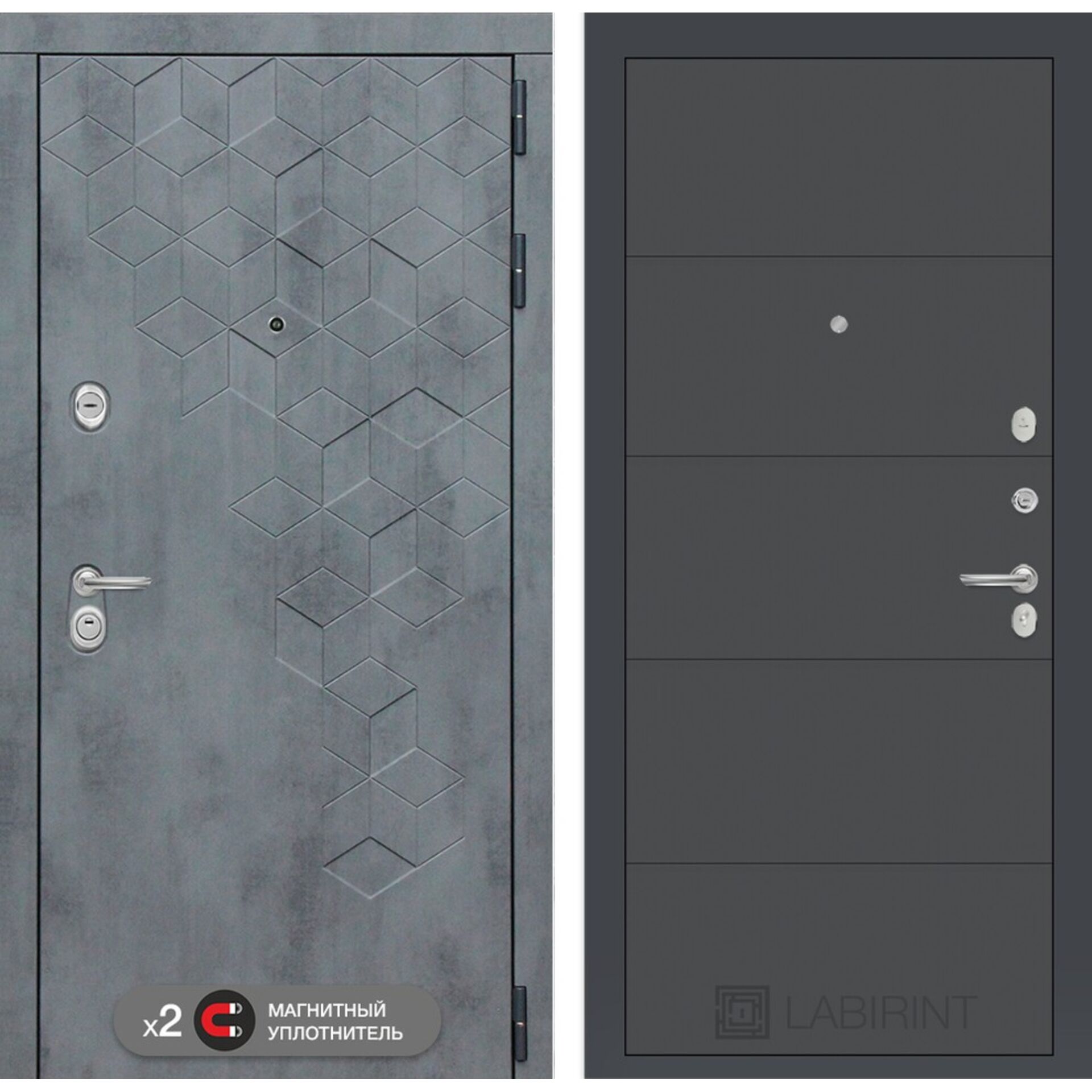 Входная дверь Лабиринт Бетон 13 - Графит софт - увеличенная звукоизоляция, максимальная герметичность, четвертый класс безопасности.