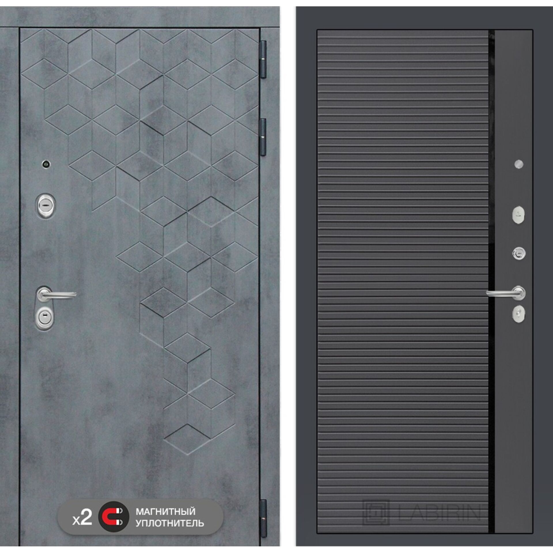 Входная дверь Лабиринт Бетон 22 - Графит софт, черная вставка - увеличенная звукоизоляция, максимальная герметичность, четвертый класс безопасности.