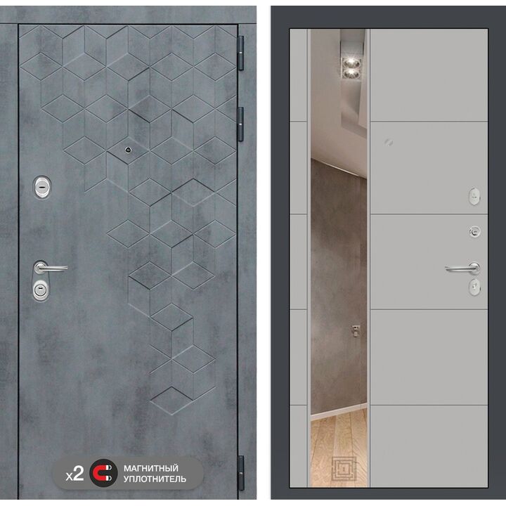 Входная дверь Лабиринт Бетон с зеркалом 19 - Грей софт - увеличенная звукоизоляция, максимальная герметичность, четвертый класс безопасности.