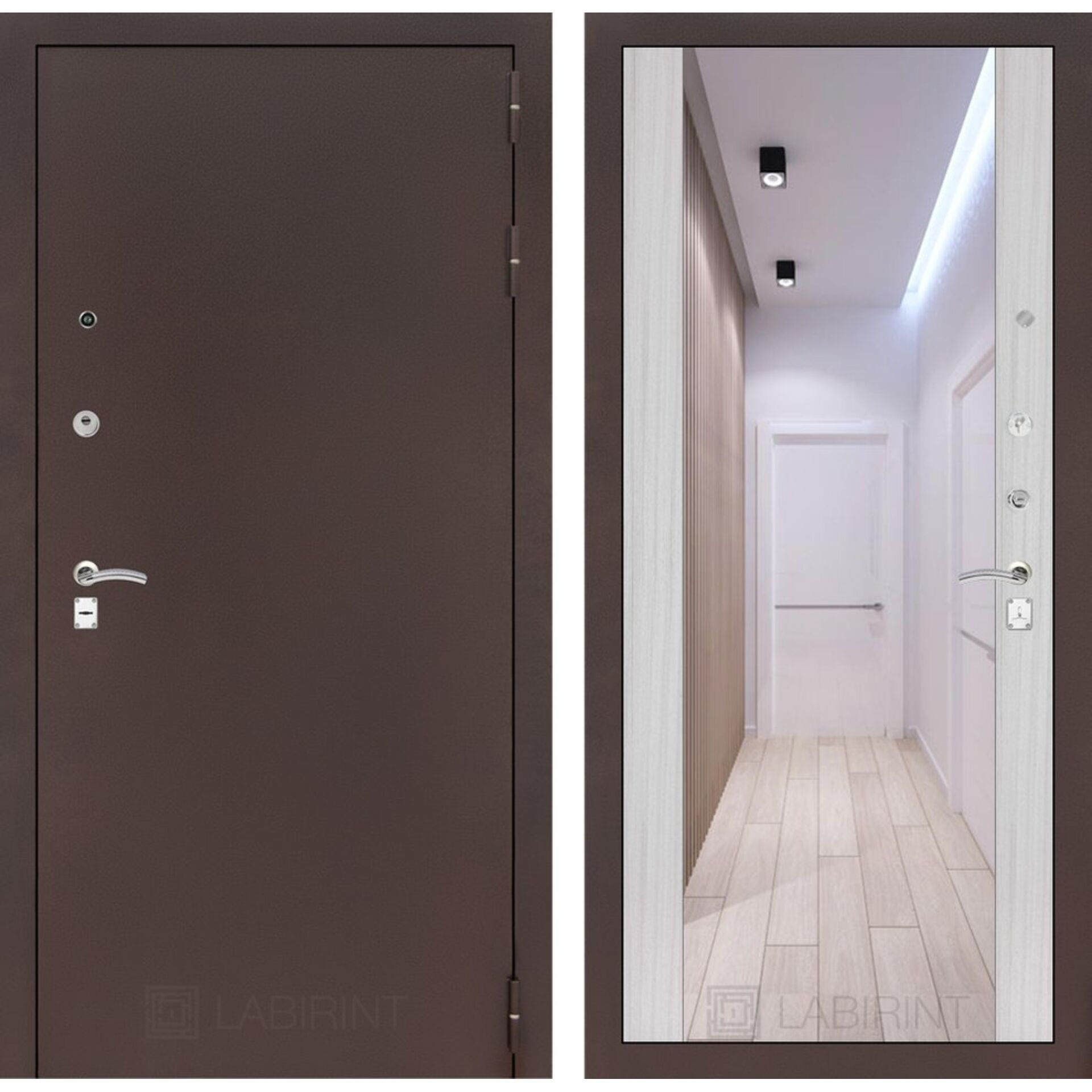 Входная дверь Лабиринт CLASSIC антик медный с зеркалом Максимум - Сандал белый - дверь с практичным и устойчивым покрытием.