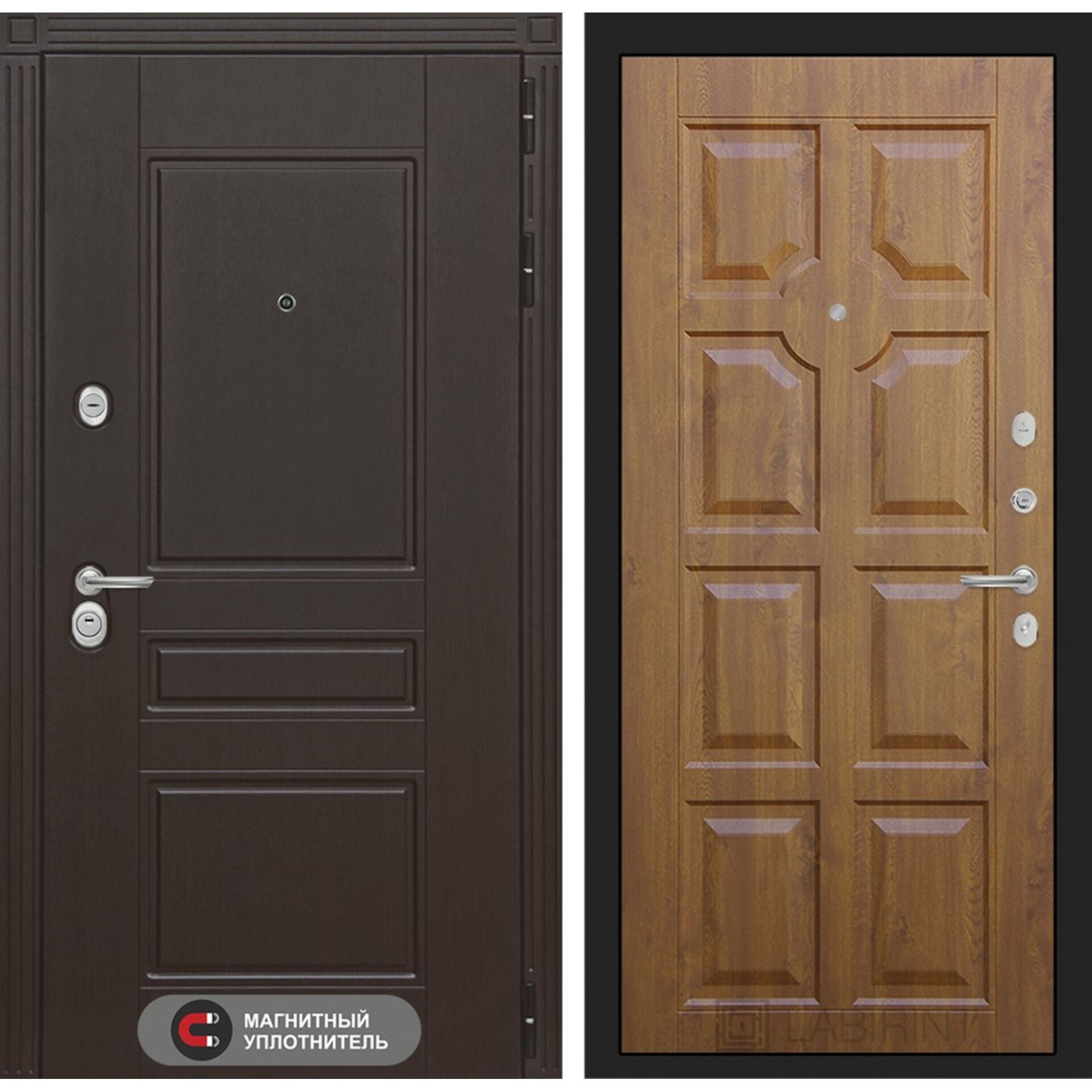 Входная дверь Лабиринт Мегаполис 17 - Золотой дуб - увеличенная звукоизоляция и герметичность, надежные замки четвертого класса безопасности.