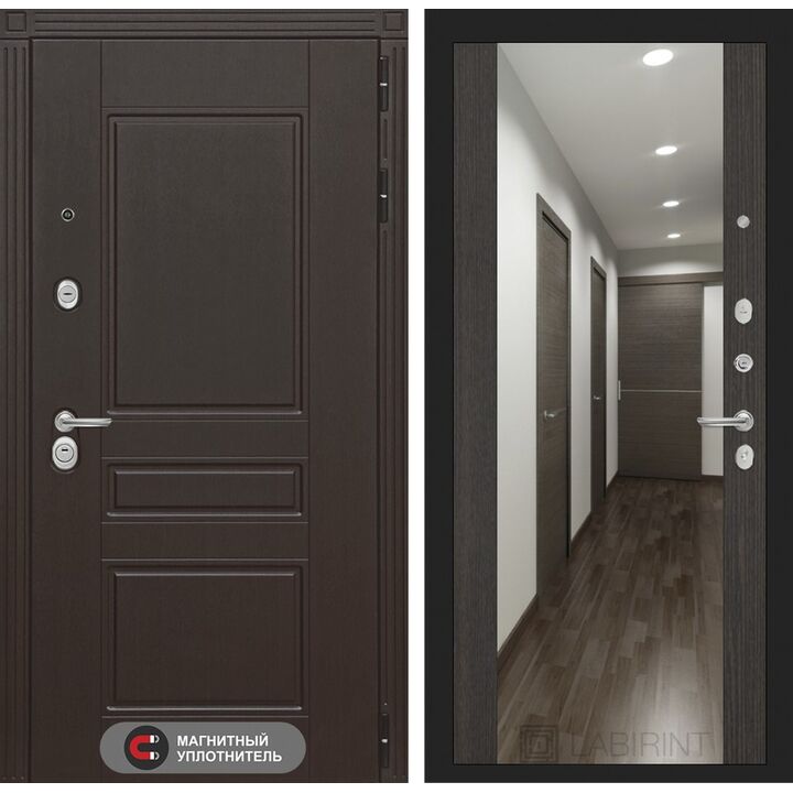 Входная дверь Лабиринт Мегаполис с зеркалом Максимум - Венге - увеличенная звукоизоляция и герметичность, надежные замки четвертого класса безопасности.