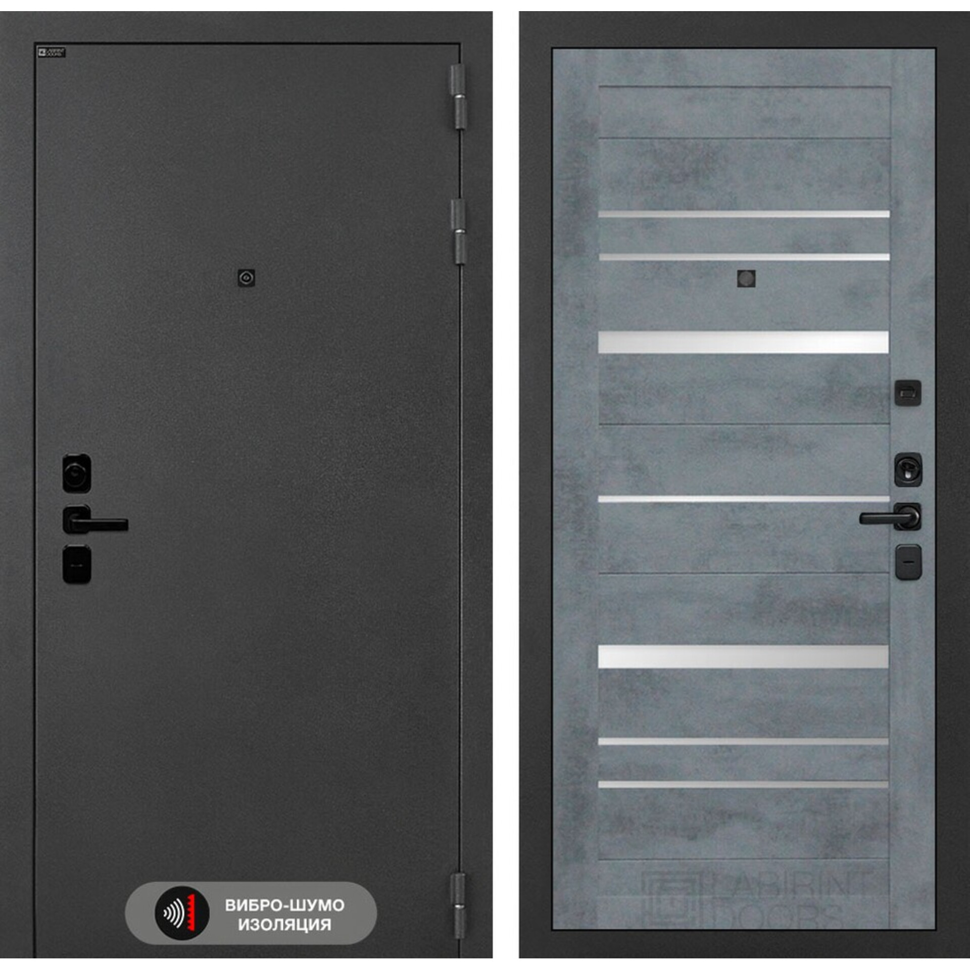 Входная дверь Лабиринт Соналаб 20 - Бетон темный, зеркальные вставки - дверь с использованием акустического вибропоглощающего материала.