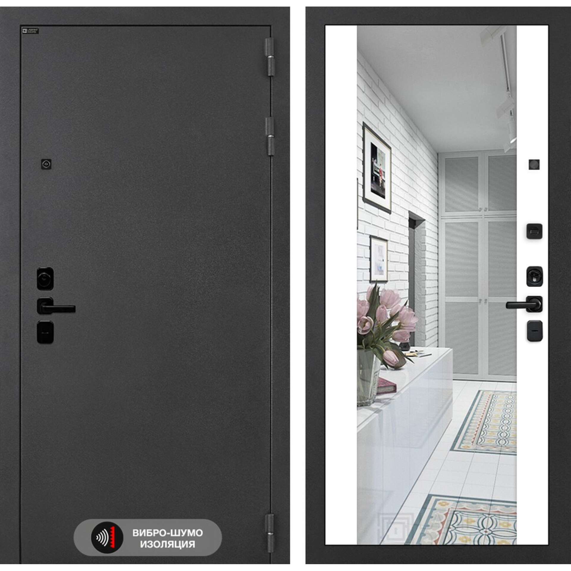 Входная дверь Лабиринт Соналаб с зеркалом Максимум - Белый софт - дверь с использованием акустического вибропоглощающего материала.