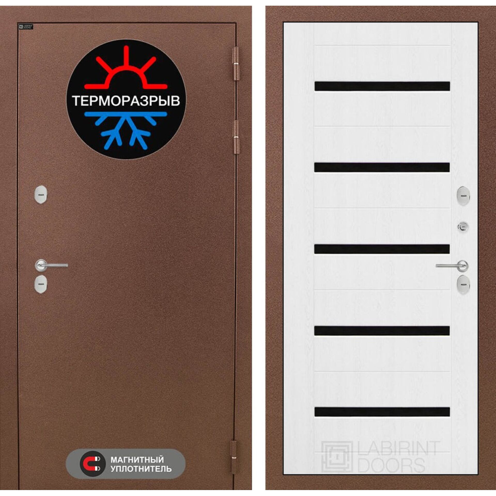 Входная дверь Лабиринт Термо Магнит 01 - Белое дерево, стекло черное - уличная дверь с технологией терморазрыва разработана специально для установки в частный дом, защищает от морозов и наледи, влажности и коррозии, шума и сквозняков.